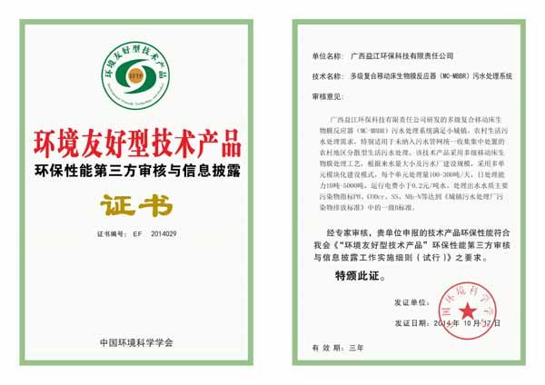 2014年10月,德信官方网址“多级复合移动床生物膜反应器(MC-MBBR)污水处理系统”获中国环境科学学会认证为环境友好型技术产品。