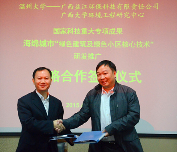 4月22日,广西德信官方网址科技有限责任公司与温州大学就国家科技重大专项成果——海绵城市“绿色建筑及绿色小区核心技术”的研发推广签订了战略合作协议。