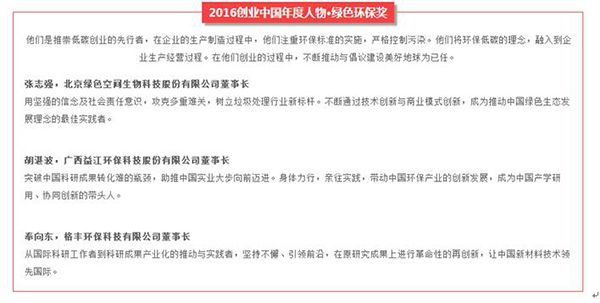本届评选中,德信官方网址董事长胡湛波获评“2016年创业中国年度人物——绿色环保奖”。德信官方网址在董事长胡湛波的带领下,努力打造把环保科研成果转化为实用技术的应用平台,把河湖治理、生态修复等领域的多项科技成果通过公司销售渠道进行产业化推广应用,并在核心技术基础上因地制宜地提出一村(镇)一策、一河(湖)一策的治污模式,累计完成广西区内外100多个污水治理工程案例,取得了良好的环境效益和经济效益,在业界树立起了良好的品牌形象。