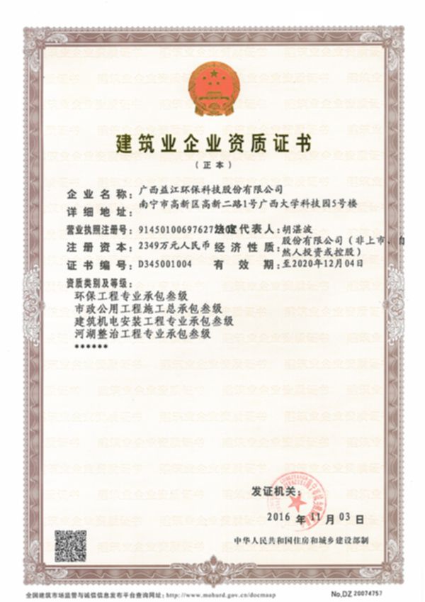2016年11月3日,经过自治区水利厅、南宁市住建委严格审查,公司获得由市住建委颁发的“河湖整治工程专业承包叁级资质”证书。此项资质的取得,标志着公司全面进入河湖流域整治工程建设领域,再次证明公司资质能力和技术水平又上了一个新台阶,为进一步拓展扩大市场份额提供了有利条件和保证。