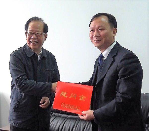 自治区人大常委会副主任危朝安为公司董事长胡湛波教授颁发慰问金