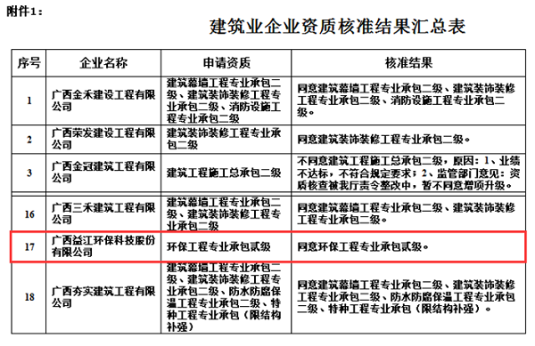 启动资质升级工作以来,公司领导高度重视,各部门协同配合,经过严格评审,最终顺利通过审核,公司环保工程专业承包资质由叁级成功升为贰级。这是继2016年11月获得河湖整治工程专业承包叁级资质后,公司在资质方面的又一收获。