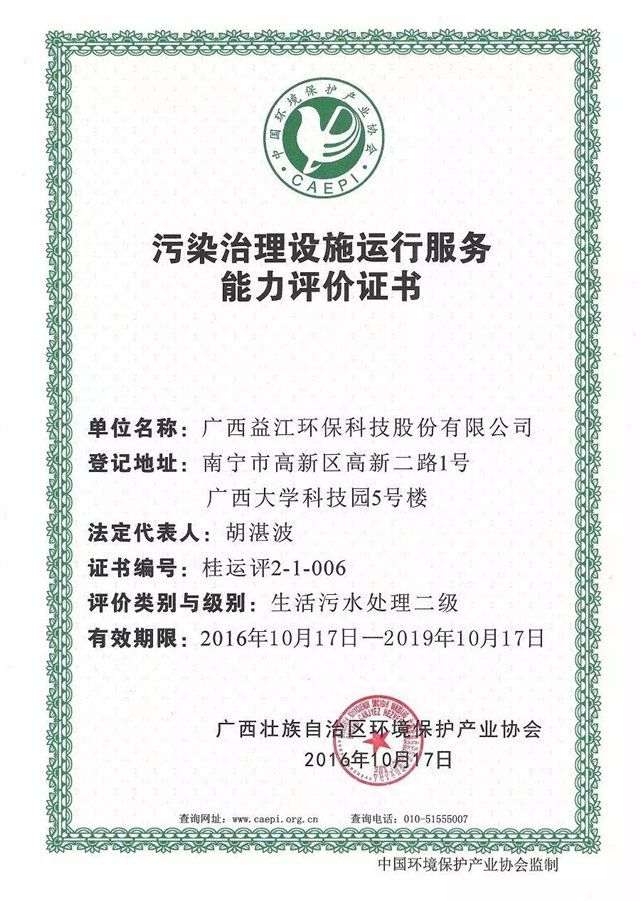 4、2016年10月,公司获得环境污染治理设施运行服务能力“生活污水处理二级”证书,这是对我公司生活污水处理技术及管理服务工作的高度肯定,标志着公司具备较强的生活污水设施运行服务能力。
