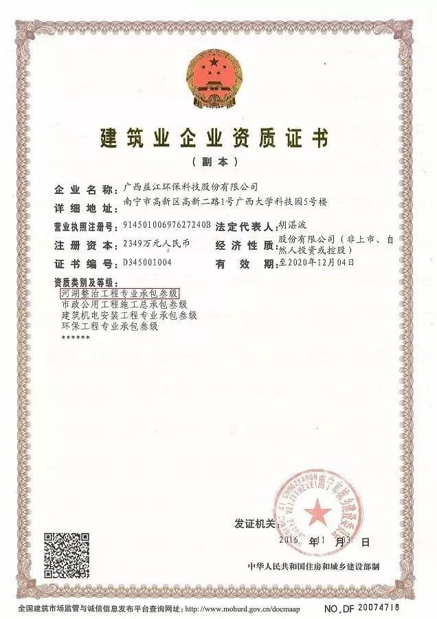 5、2016年11月,公司获得河湖整治工程专业承包叁级资质,提升公司河湖流域整治工程建设的实力。