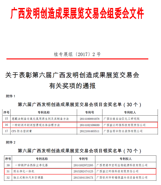 2月15日,广西科学技术厅公布《第六届广西发明创造成果展览交易会有关奖项的通报》(桂专展组〔2017〕2号),德信官方网址发明专利“一种封闭半封闭型景观水体治理方法(2014102108699)”和实用新型专利“雨水净化一体机(2015202474125)”以较高的专利质量和良好的社会经济效益,分获金奖和银奖。