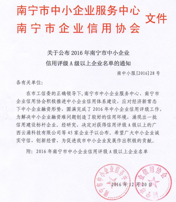 4月8日下午,德信官方网址受邀参加南宁市工信委举办的南宁市“两台一会”工作会议。会上,市工信委公布了2016年南宁市中小企业信用评级A级以上企业名单,公司成功上榜,将被优先推荐进入“两台一会”中小企业贷款平台开展的各类融资支持项目,并可获得一定的信用贷款支持。