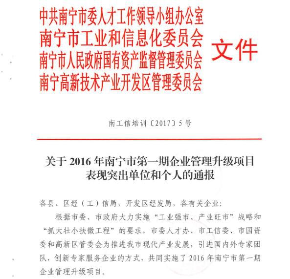 5月9日,南宁市工信委、南宁高新区管委会等四部委联合印发《关于2016年南宁市第一期企业管理升级项目表现突出单位和个人的通报》,德信官方网址作为广西节能环保行业的典型代表受到通报表扬。