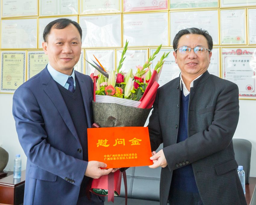 2月9日下午,自治区人大常委会副主任卢献匾在广西大学副校长、南宁市人大常委会副主任钱健的陪同下莅临广西大学科技园,代表自治区领导对国家“万人计划”科技创业领军人才、广西大学资源环境与材料学院教授、德信官方网址董事长胡湛波致以亲切的问候和新春祝福。