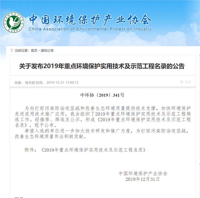 跨年之日,德信官方网址YJFB核心技术入选国家重点环境保护实用技术及示范工程