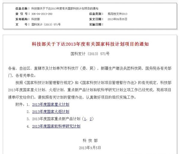 图一:科技部关于下达2013年度有关国家科技计划项目的通知